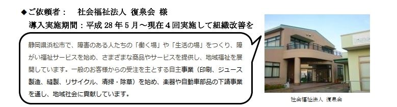 以上、 見えない領域をあえて見える化しながら、福祉業界のリーダー的存在として時代の変化に適応し、更なる組織力強化と福祉サービスの質的向上に取り組んでいる復泉会様でありました。これからが、益々楽しみです。(須山)