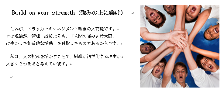 互いにそう考えることで、非生産的で内向きな揉め事も少なくなり、生産的に仕事が進むようになります。以上のように、部下の‘強み’を活かす。お試し下さい。
