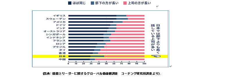 すると・・・、どうも日本の上司は、『話し合って』いるつもりが、『上司の方が長く』しゃべっているようです。確かに、私の知っている企業でもよく面談を実施しますが、部下と向き合って対話しているつもりが、上司が一方的に話している場面をよく目にします。