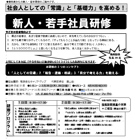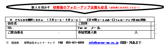 そのためにも、日々の中で交換日記的に業務日報を書かせたり、こまめな声掛け、部下のペースを把握した指導の仕方にも気を配ることは大切でしょう。また、新人には研修・フォーアップ研修等を受講してもらい、仕事の上手な受け方・進め方の教育も必要でしょう。また、上司については、「指導の仕方研修」など、受け入れ側の教育体制も必要になっていきます。 さて、皆さんの会社ではこの体制づくりはできているでしょうか。