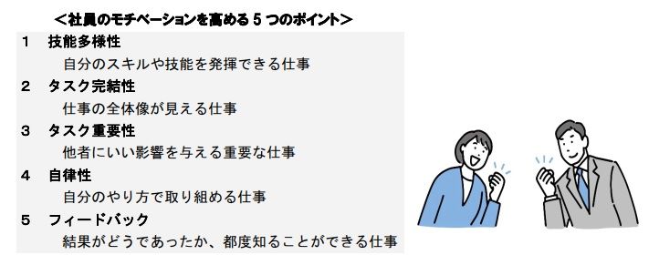 人は、その会社に魅力を感じたりモチベーションが上がるポイントには、下記の5点があげられます。(心理学者リチャード・ハックマン・経営学者グレッグ・オルダムが理論化した「職務特性モデル」より)