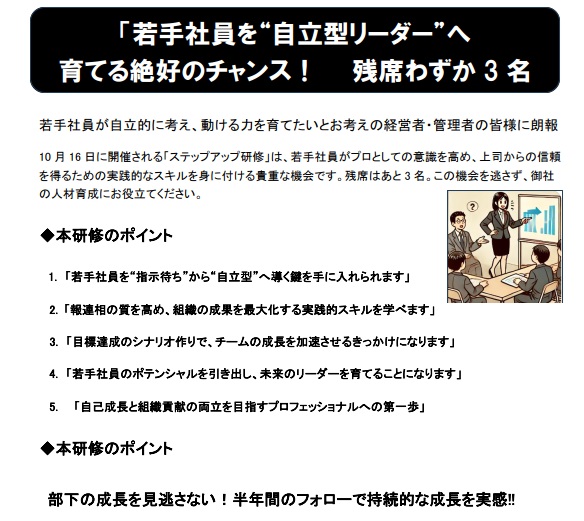 ステップアップ研修は10月16日です。皆様にお会いできることを楽しみにしています。まだ空席が少しございますので、ぜひお問い合わせください。